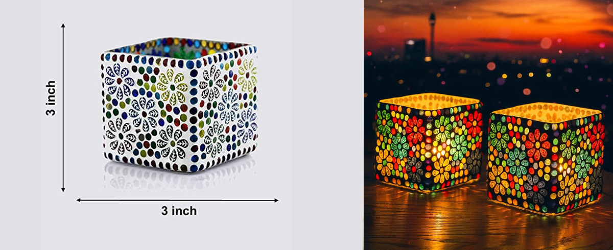 Elegant Mosaic Design: Handcrafted square tealight holders adorned with vibrant mosaic-style glass pieces—ideal for elevating your décor with a pop of color and artistry.